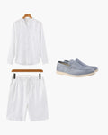 The Tranquil Set embodies the essence of minimalist luxury. Crafted from soft linen and suede, this collection features a classic 100% linen shirt, relaxed linen shorts, and refined suede loafers—all in neutral beige tones that speak to those who appreciate quiet sophistication and understated style.